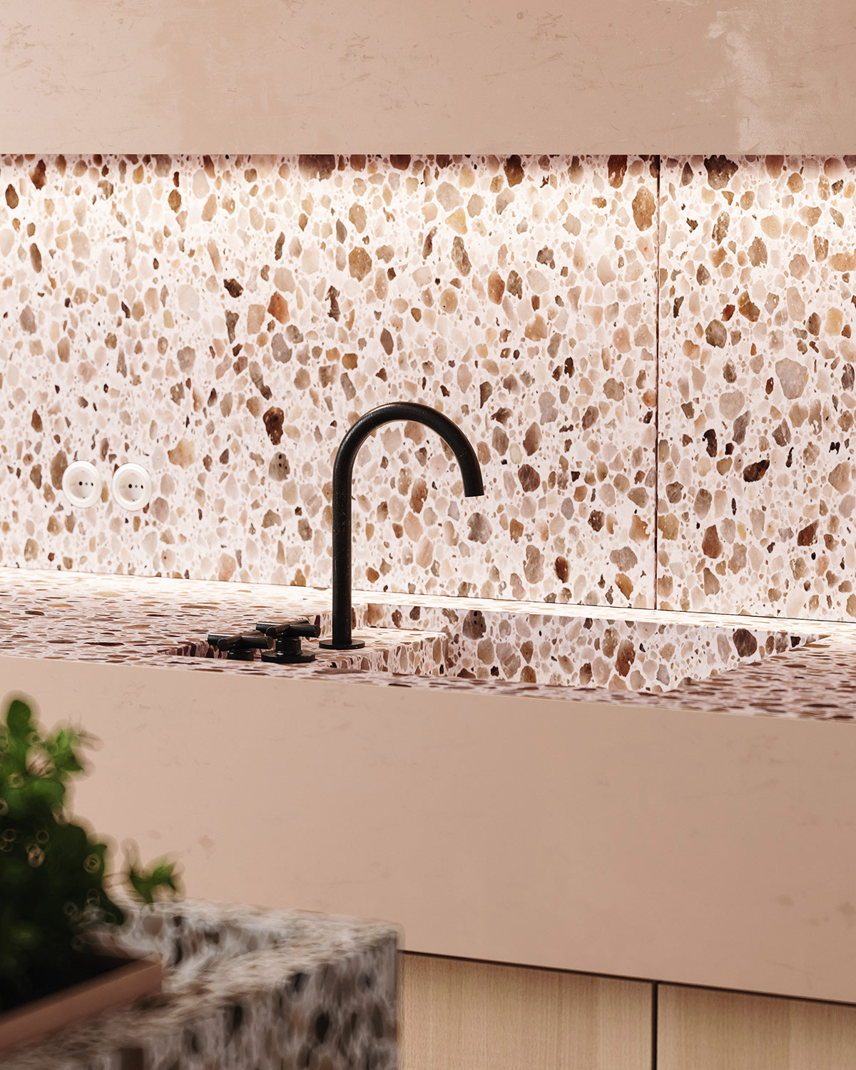 Terrazzo также вырезает кухонную раковину в соответствующей столешнице.