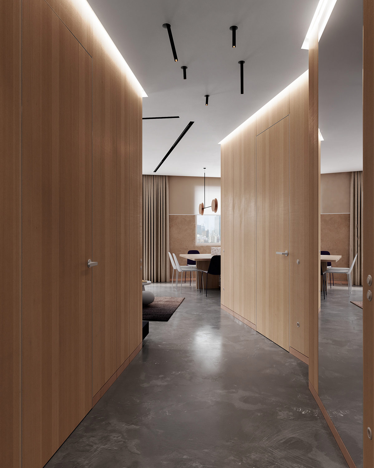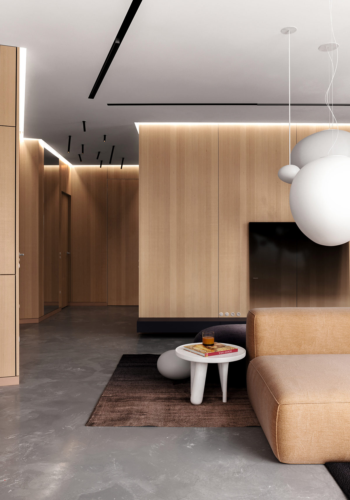 Удивительно мягкое декоративное освещение исходит от встроенных светодиодов. Свет по периметру заливает деревянные стены в гостиной, подчеркивая их текстуру, и продолжается дальше по коридору.