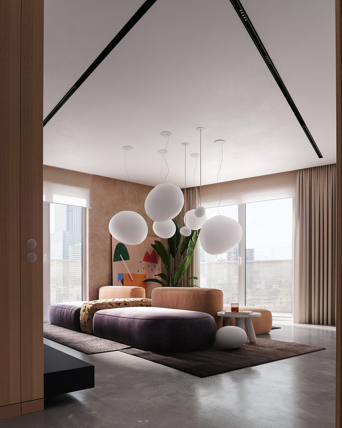 Глядя в потолок, схема освещения полна новых чудес. Световые дорожки образуют черные линии по границе комнаты, прожекторы спускаются по стеблям в коридоре, а скульптурные подвесные светильники группируются над диваном.