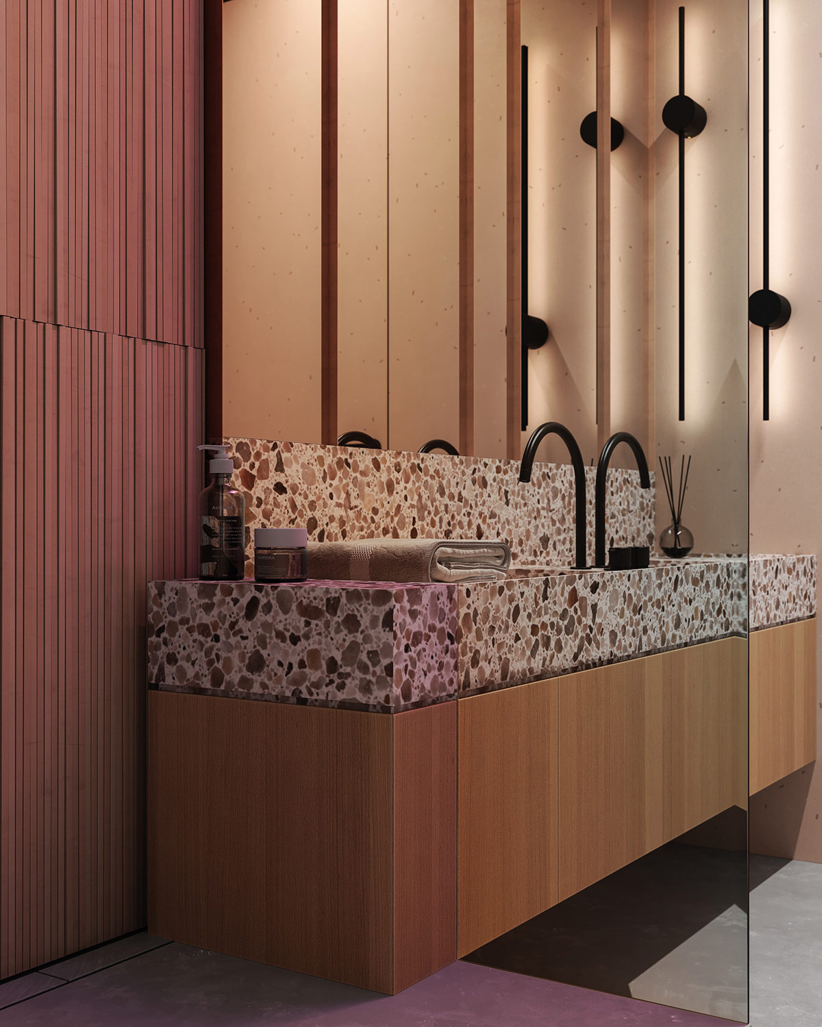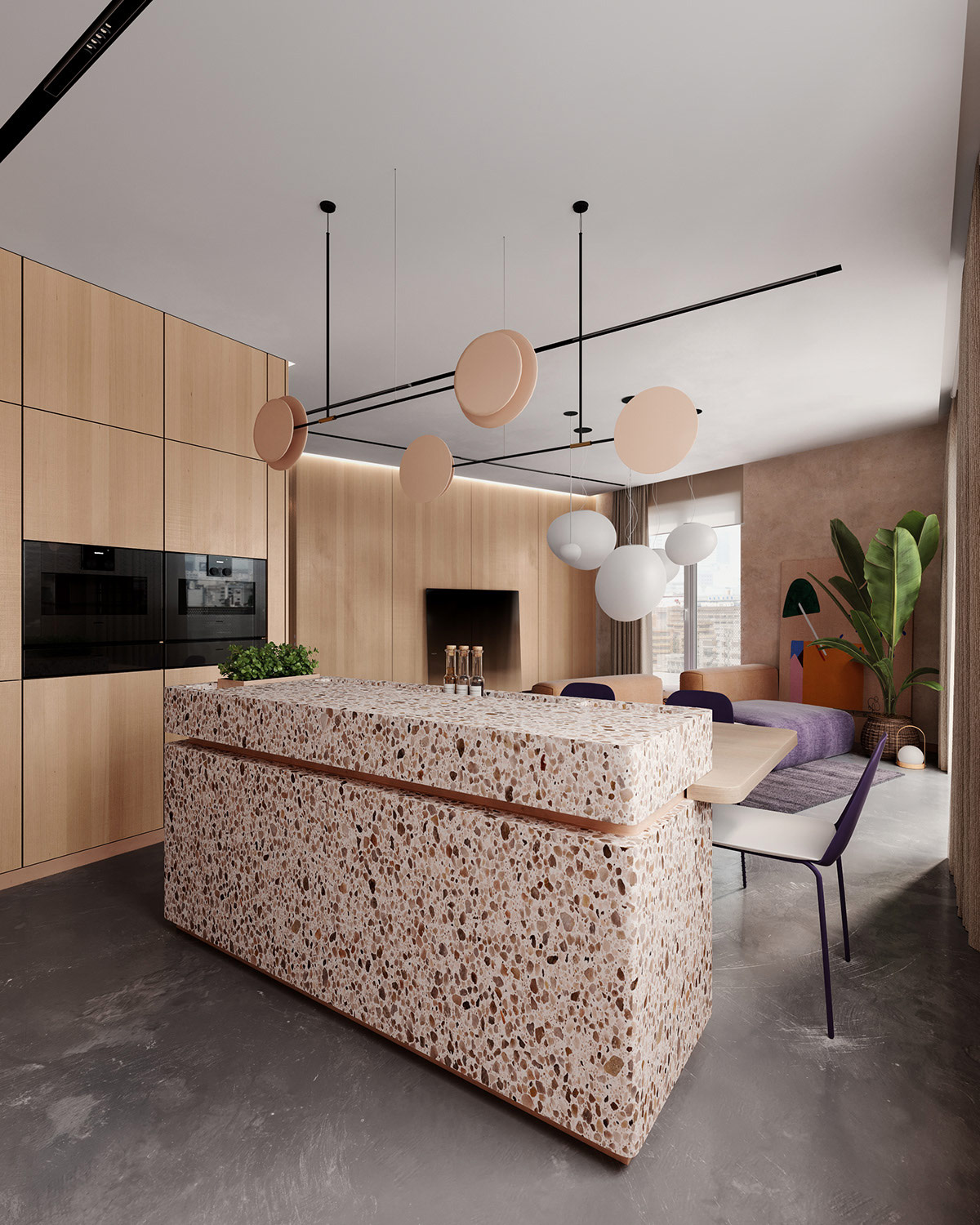 Тот же оттенок дерева и терраццо создают единую схему, связывающую каждую комнату в доме.