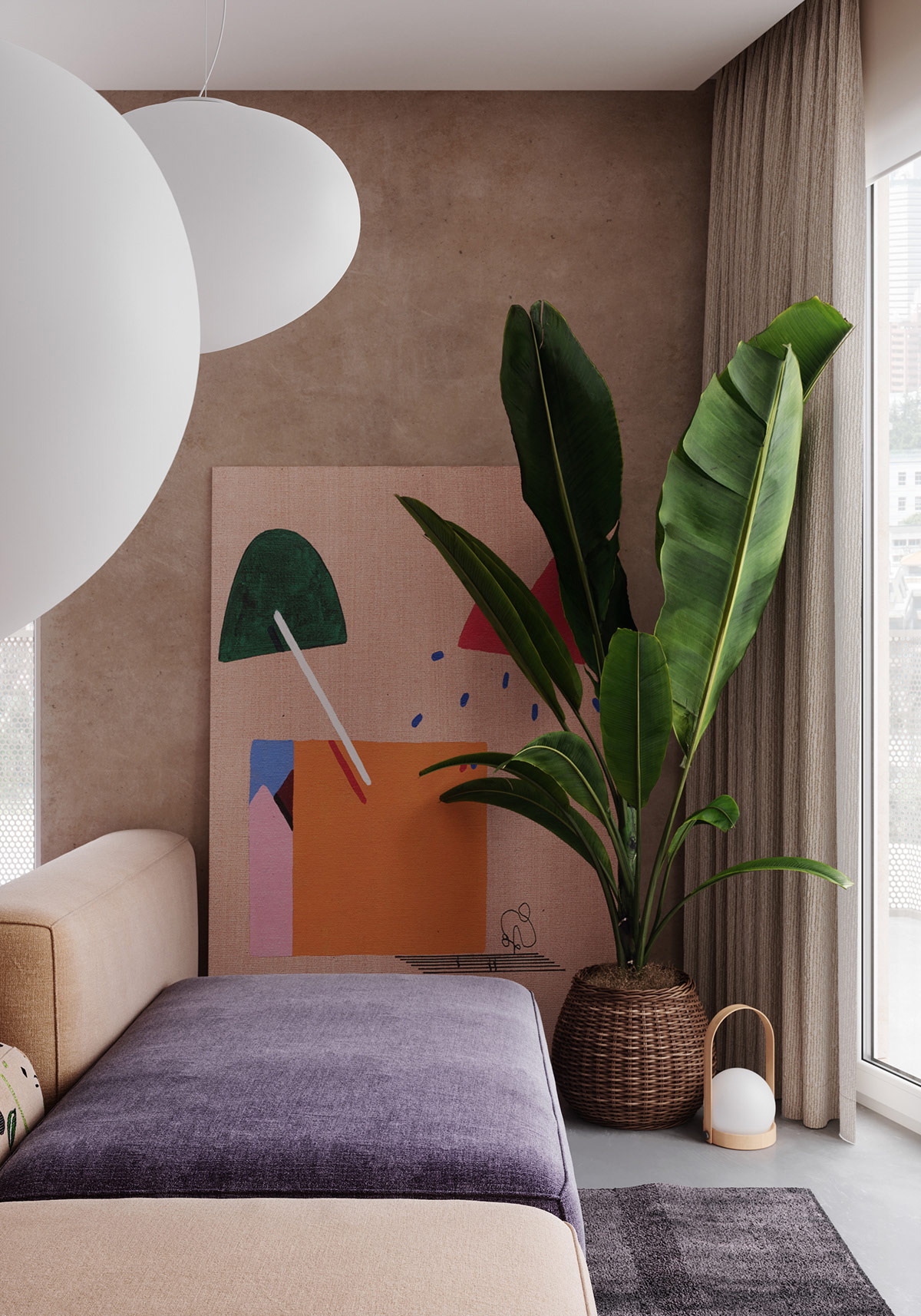 Современное искусство добавляет большую инъекцию цвета наряду со зрелым комнатным растением. Корзина из ротанга сочетается с другими природными экологическими материалами в комнате, перекликаясь с различными текстурами дерева, рельефной штукатуркой и гладким бетоном.