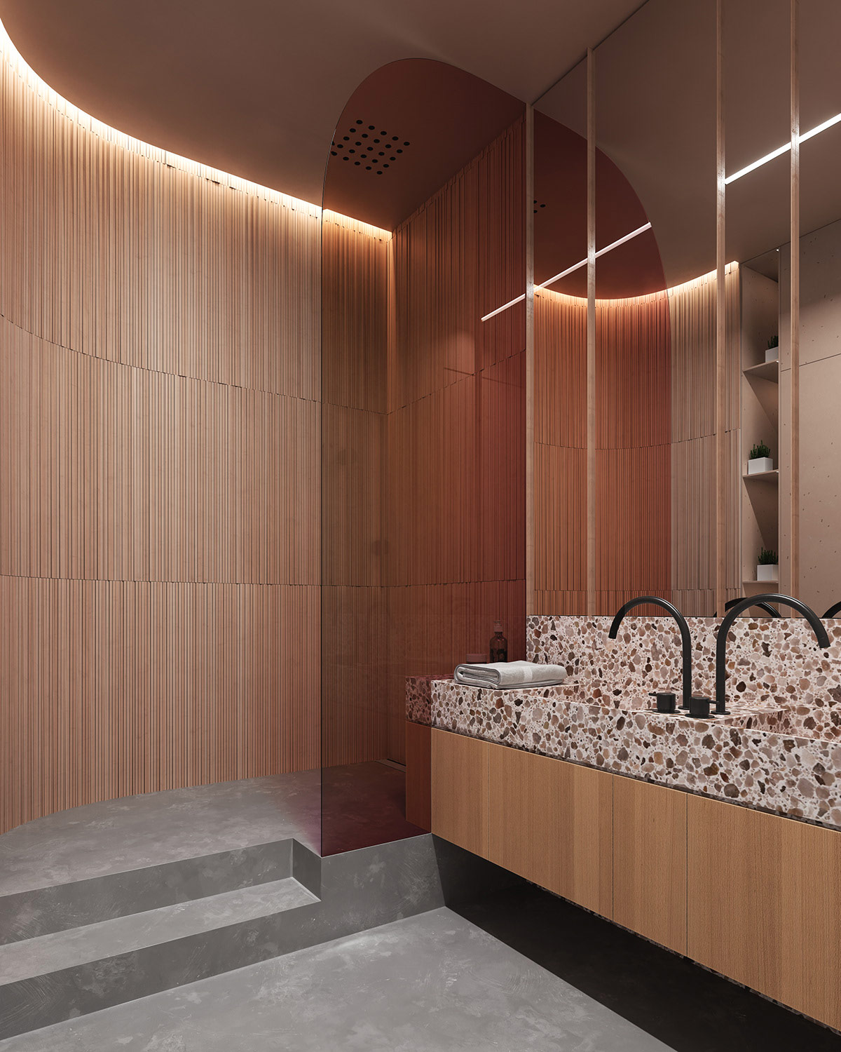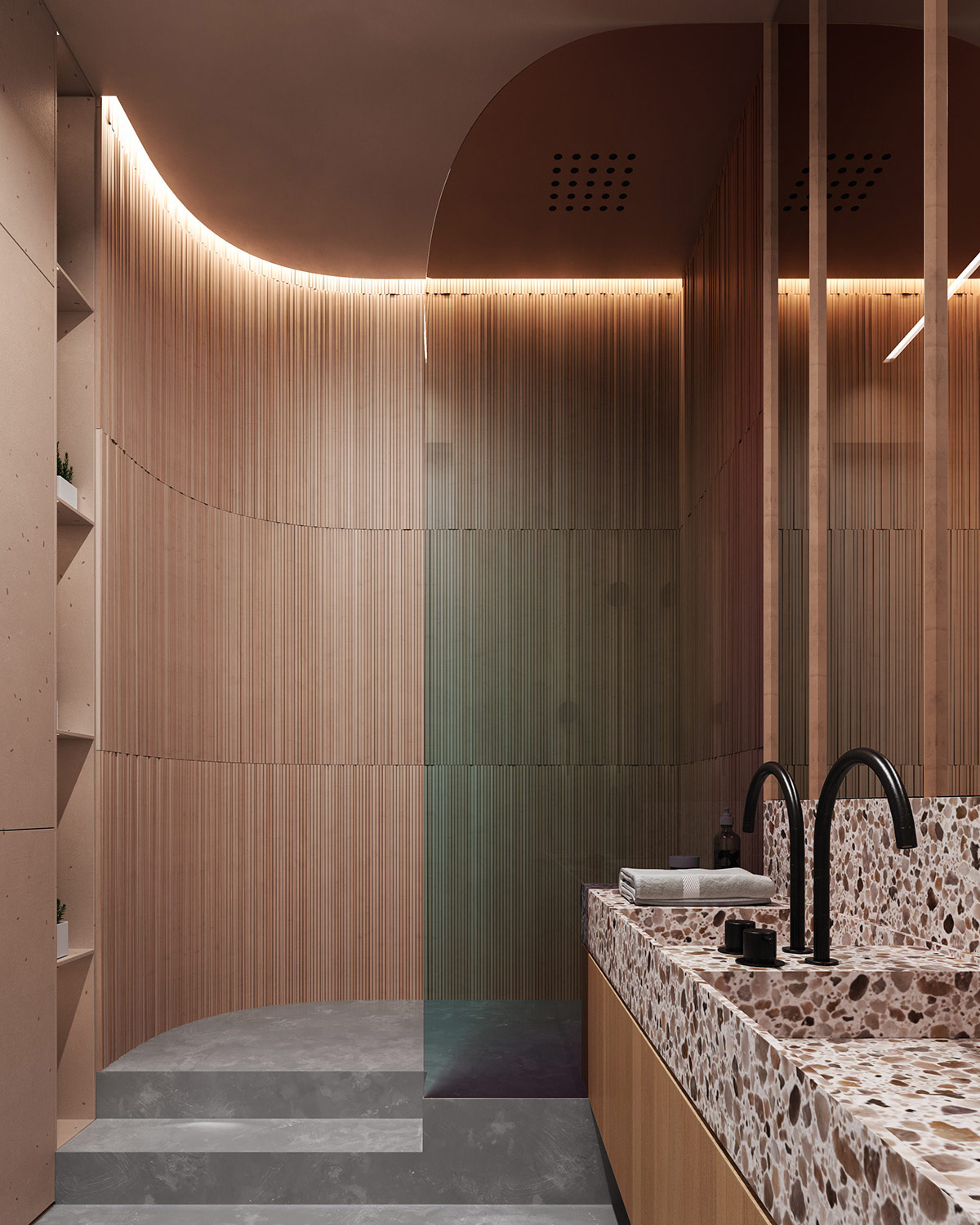 Бетонные ступени ведут к изогнутой душевой кабине.
