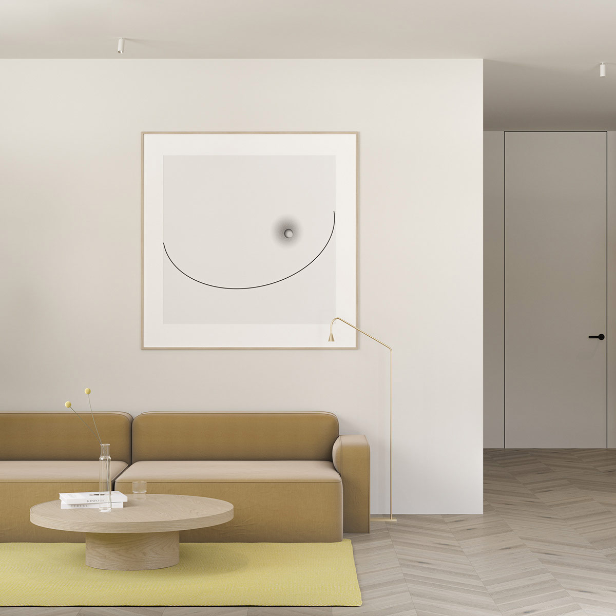 Мы идем рядом с квартирой площадью 85 квадратных метров в Киеве, Украина, где бежевый современный диван приземляется на ковер лимонного цвета. Круглый журнальный столик из светлого дерева сочетается с цветом дивана, а тонкий торшер действует как визуальная остановка между гостиной и прихожей.