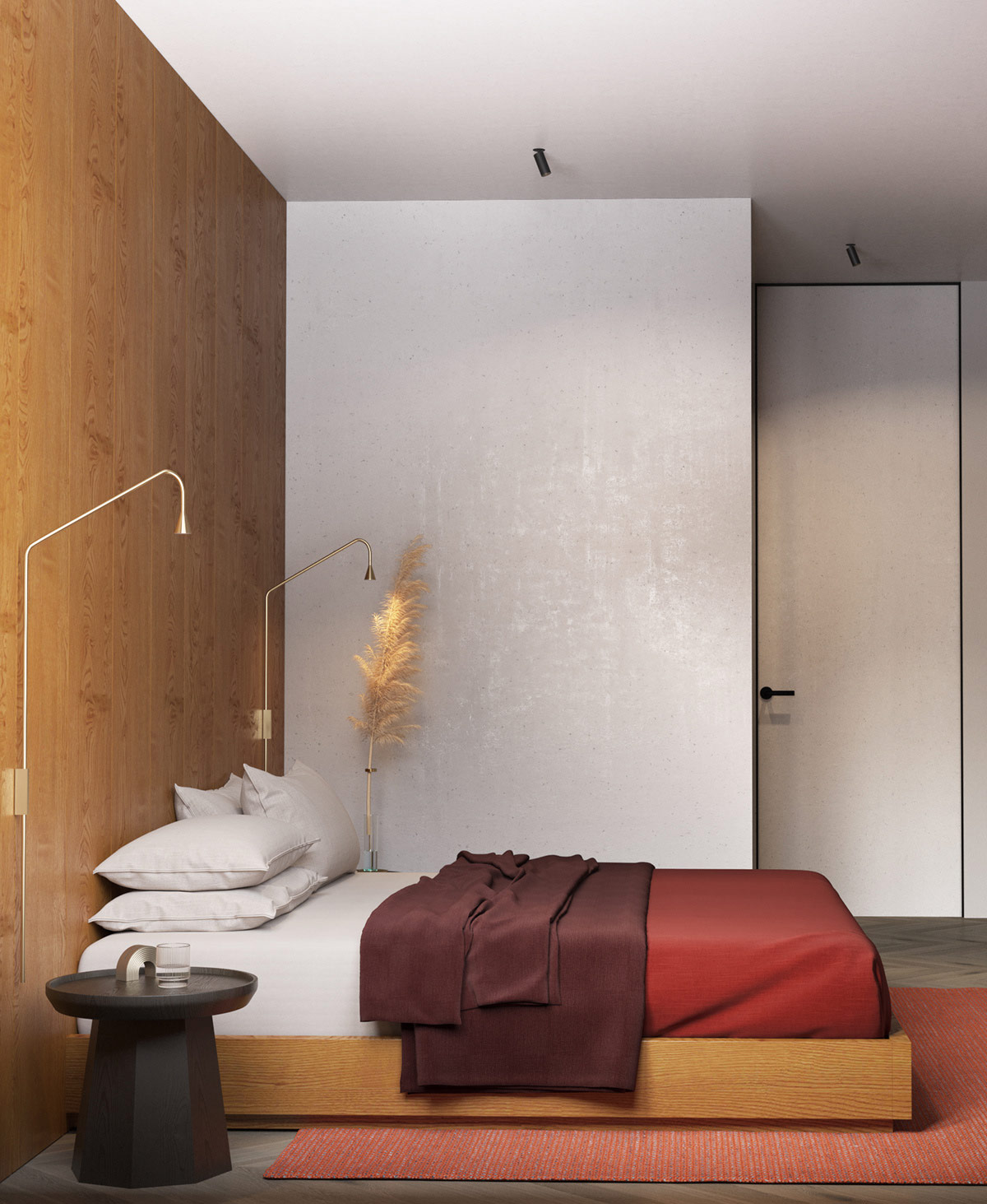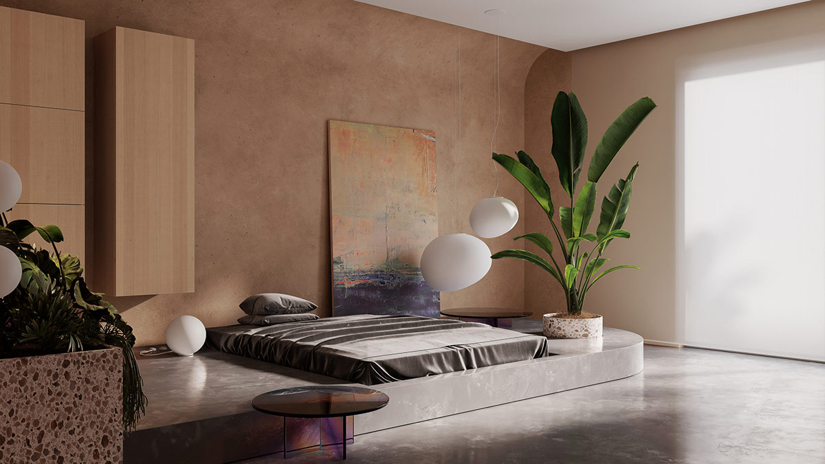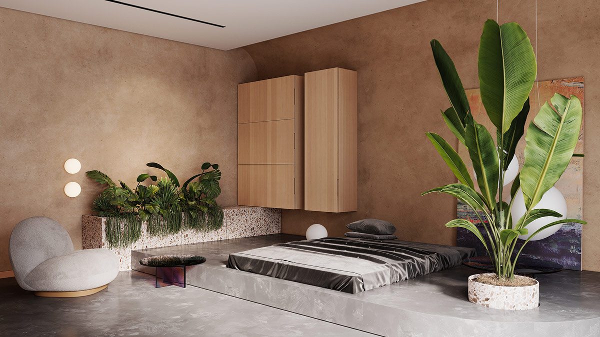 Бетон заливает пол по всему дому и создает в мастере индивидуальный дизайн напольной кровати. Кашпо Terrazzo включены в уникальное творение. Зеленые комнатные растения привносят изумрудно-зеленый цветовой акцент.