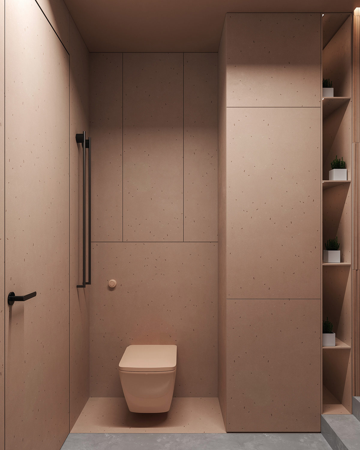 Место для хранения в ванной гармонирует с гладкими бежевыми стенами.