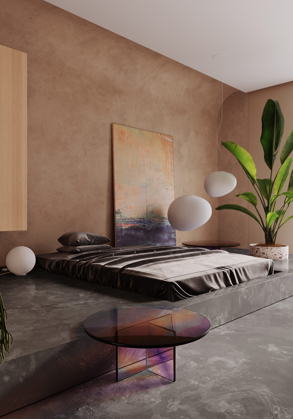 Еще один стол из разноцветного стекла перекрывает край бетонного основания кровати.