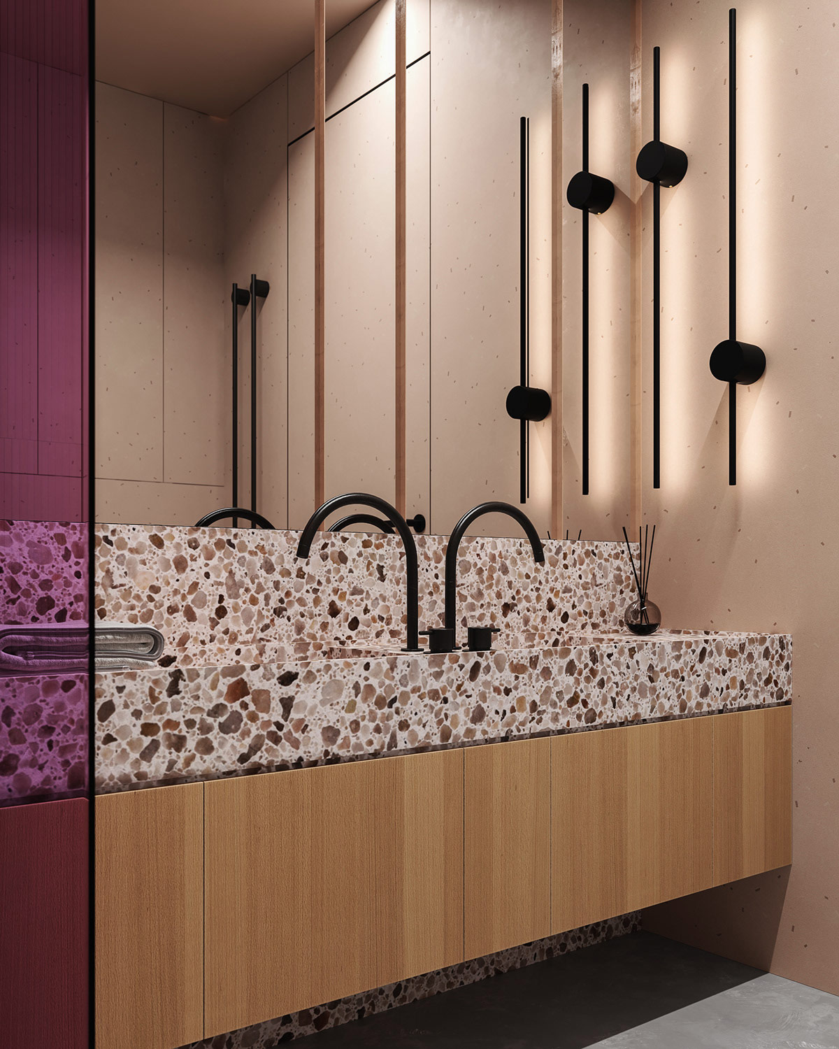В ванной комнате перегородка для душа выполнена из разноцветного стекла. Бежевый терраццо украшает современный туалетный столик.