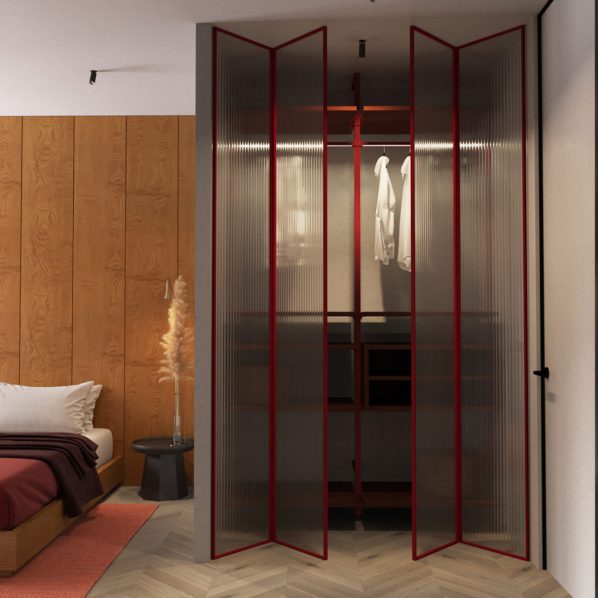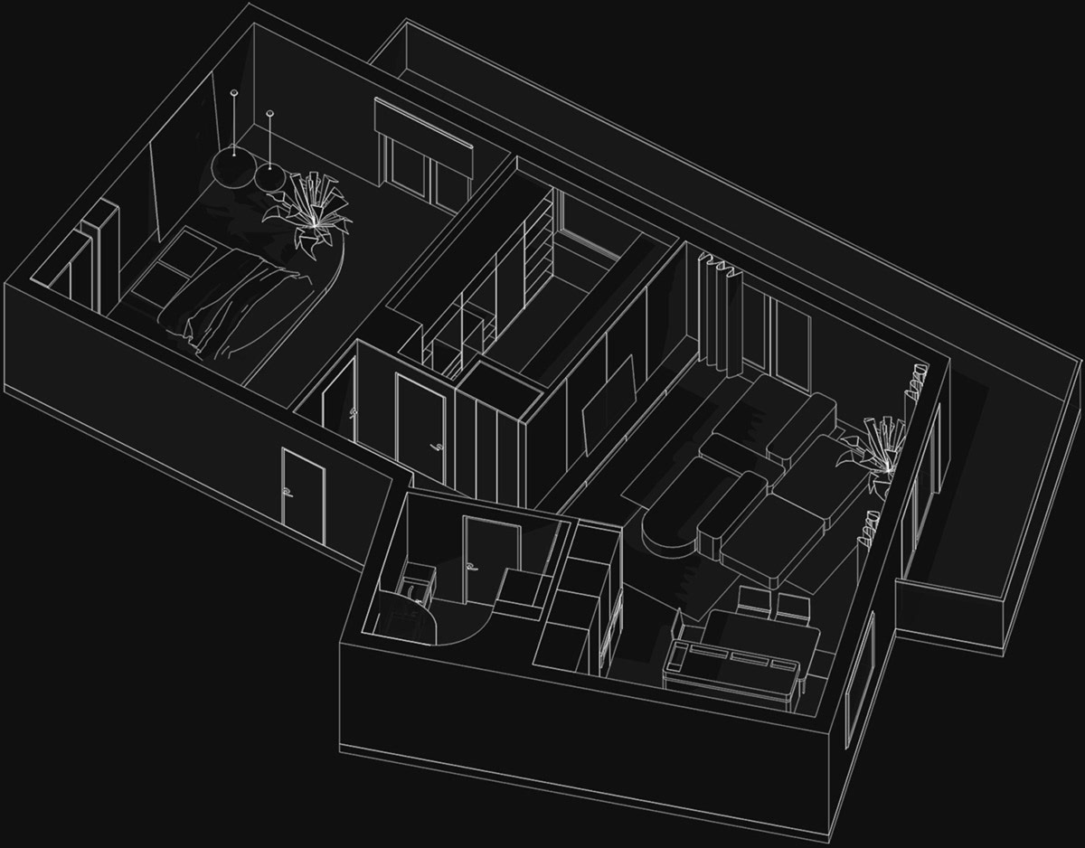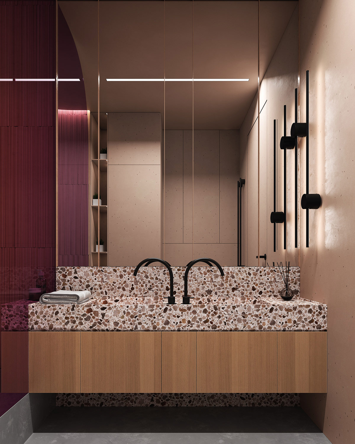 Косметическое зеркало окутывает две стены, увеличивая ощущение пространства и света в комнате без окон.