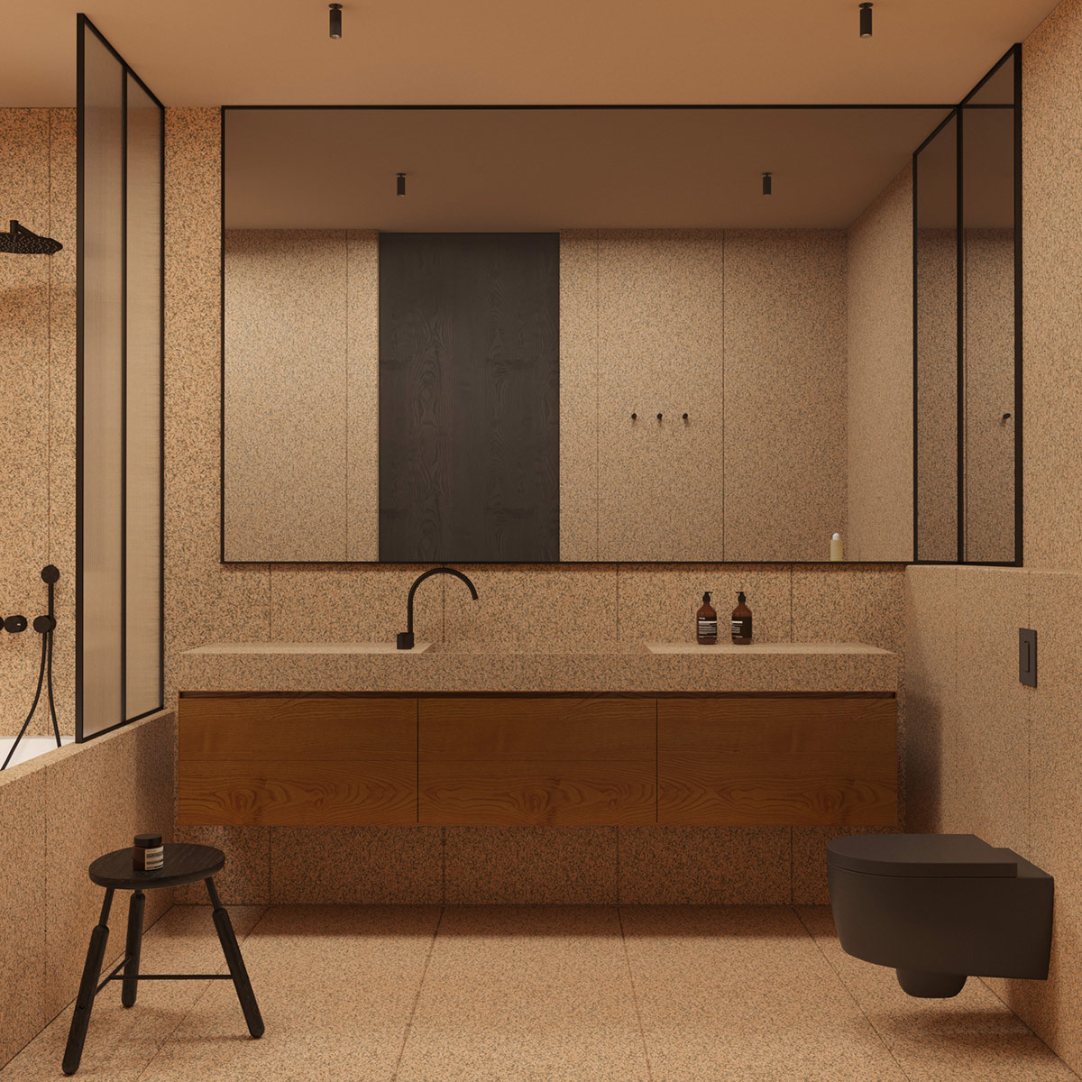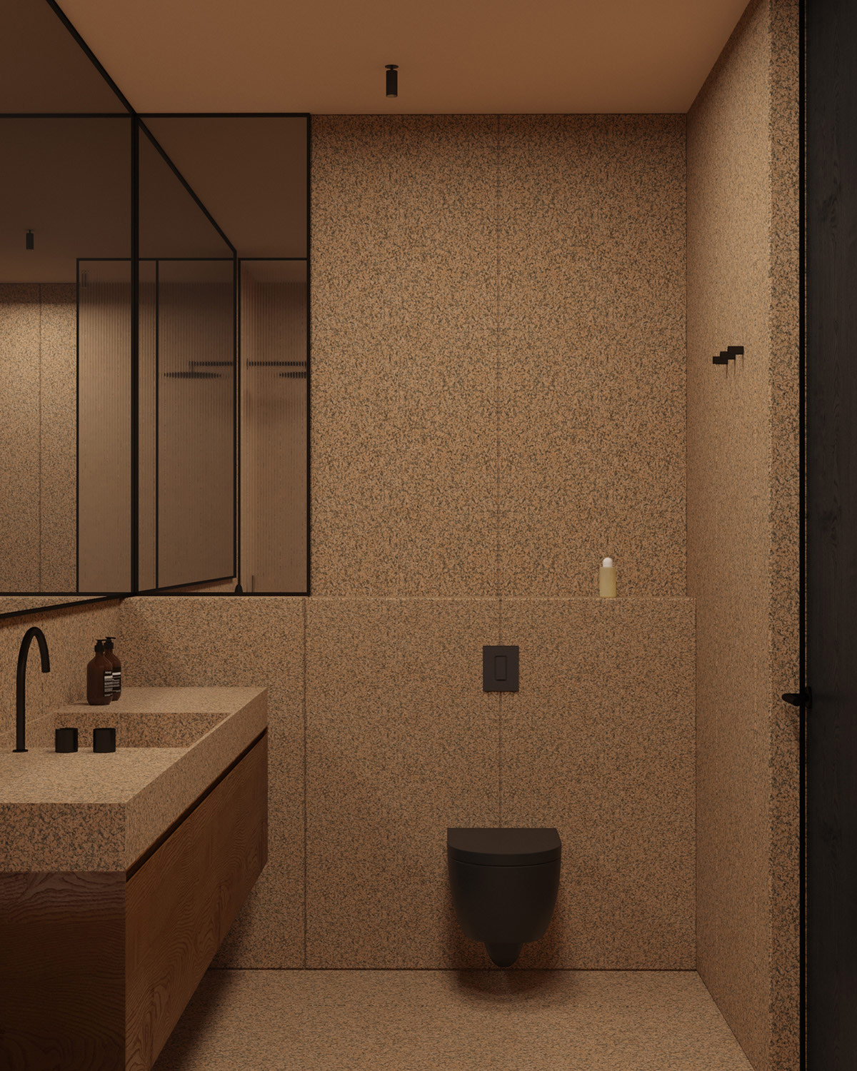 Цветовая гамма возвращается к преобладающему бежевому царству в ванной комнате, но на этот раз с долей графита и современным деревянным туалетным столиком.