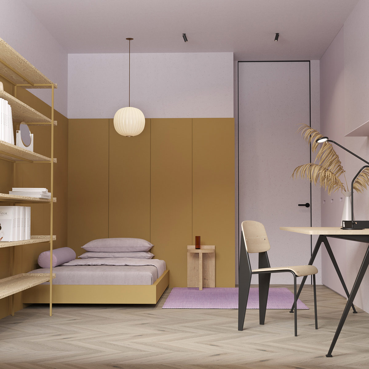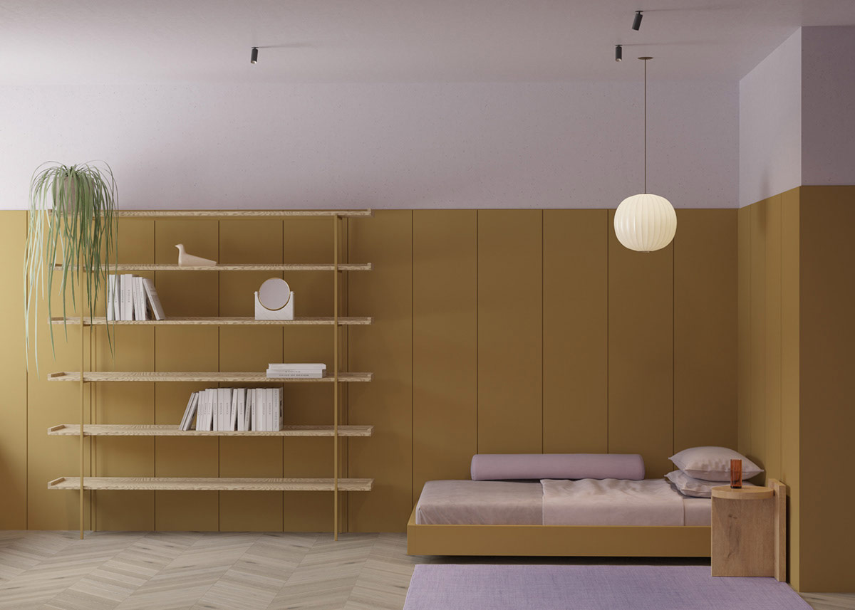 Стены окрашиваются желтыми панелями, и сделанная на заказ кровать-платформа соответствует их тону.