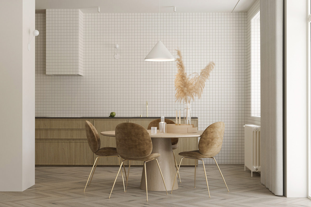 Как и в гостиной, все теплые цвета в кухне-столовой ограничены нижней половиной комнаты. Золотые обеденные стулья окружают массивный круглый обеденный стол перед кухонными шкафами из светлого дерева. Белая кухонная плитка и простой белый подвесной светильник в столовой размывают верхнюю часть.