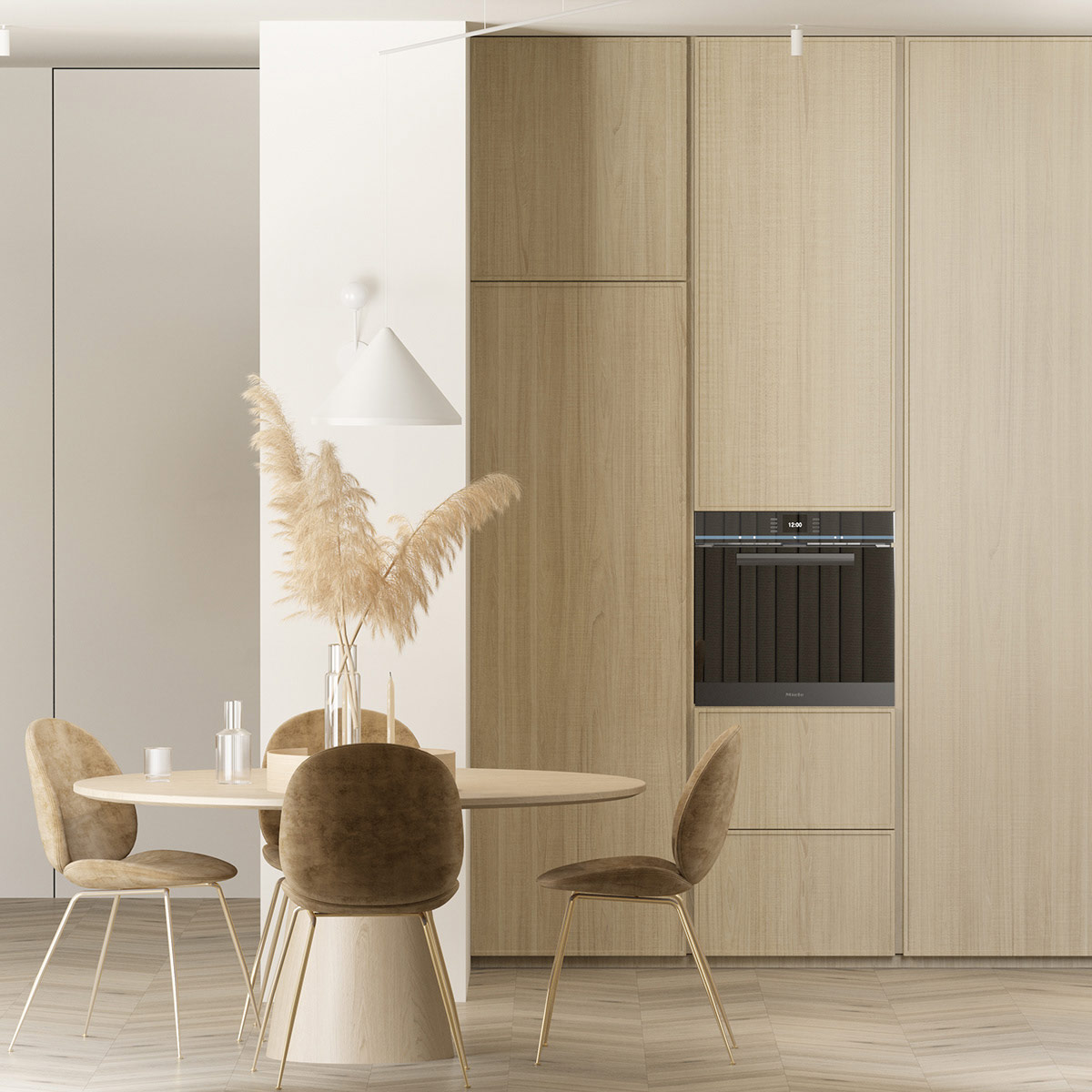 Бежевая цветовая гамма переходит в кухню-столовую на противоположном конце открытой планировки.