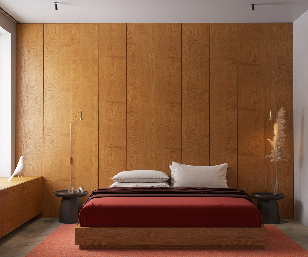Вторая спальня получает тепло от красных тонов, наслоенных постельным бельем и большим ковриком под кроватью. Птица Эймс прыгает по верхней части сиденья у окна из голого дерева, а соответствующие деревянные панели дополняют уютную стену изголовья.